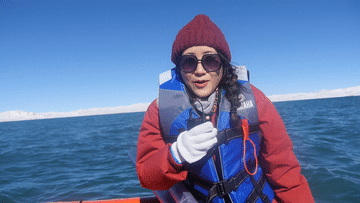 第一天早上,一路顛簸了近4個(gè)小時(shí),我們一行抵達(dá)雀莫錯(cuò)。雀莫錯(cuò)是位于長江源頭區(qū)域的一個(gè)較大的湖泊。當(dāng)天,中科院青藏所的專家們需要在湖中心取水樣。站在湖邊,風(fēng)特別大,陽光刺到睜不開眼。通過反復(fù)溝通,我們爭取到了和專家一起上船采樣的機(jī)會(huì)。為什么要上湖?在湖邊出個(gè)鏡不香嗎?因?yàn)槲沂冀K相信,要拍到生動(dòng)的一手資料,那就得離得足夠近。