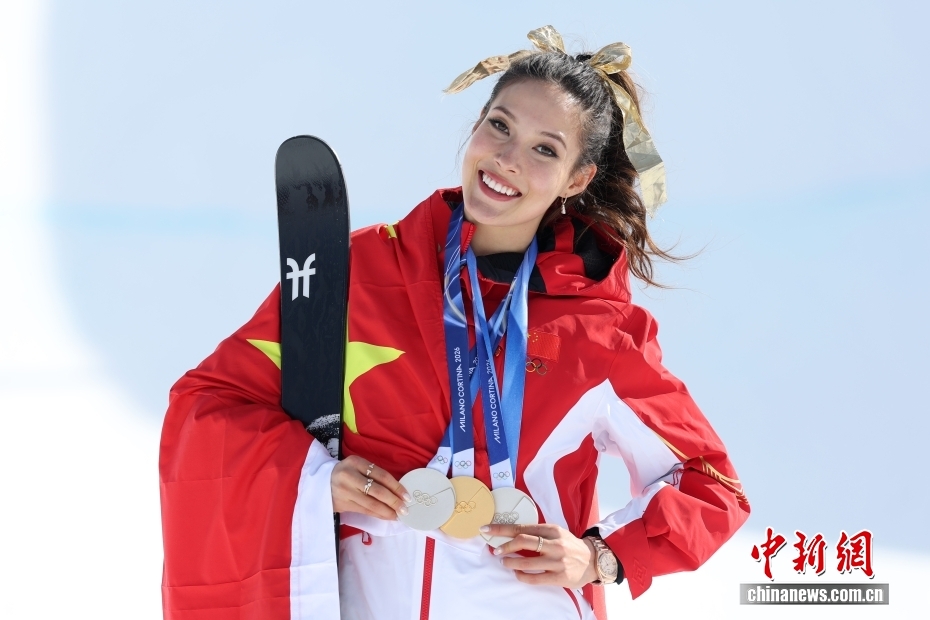當(dāng)?shù)貢r(shí)間2月22日,中國(guó)選手谷愛凌展示其本屆冬奧會(huì)獲得的三枚獎(jiǎng)牌。