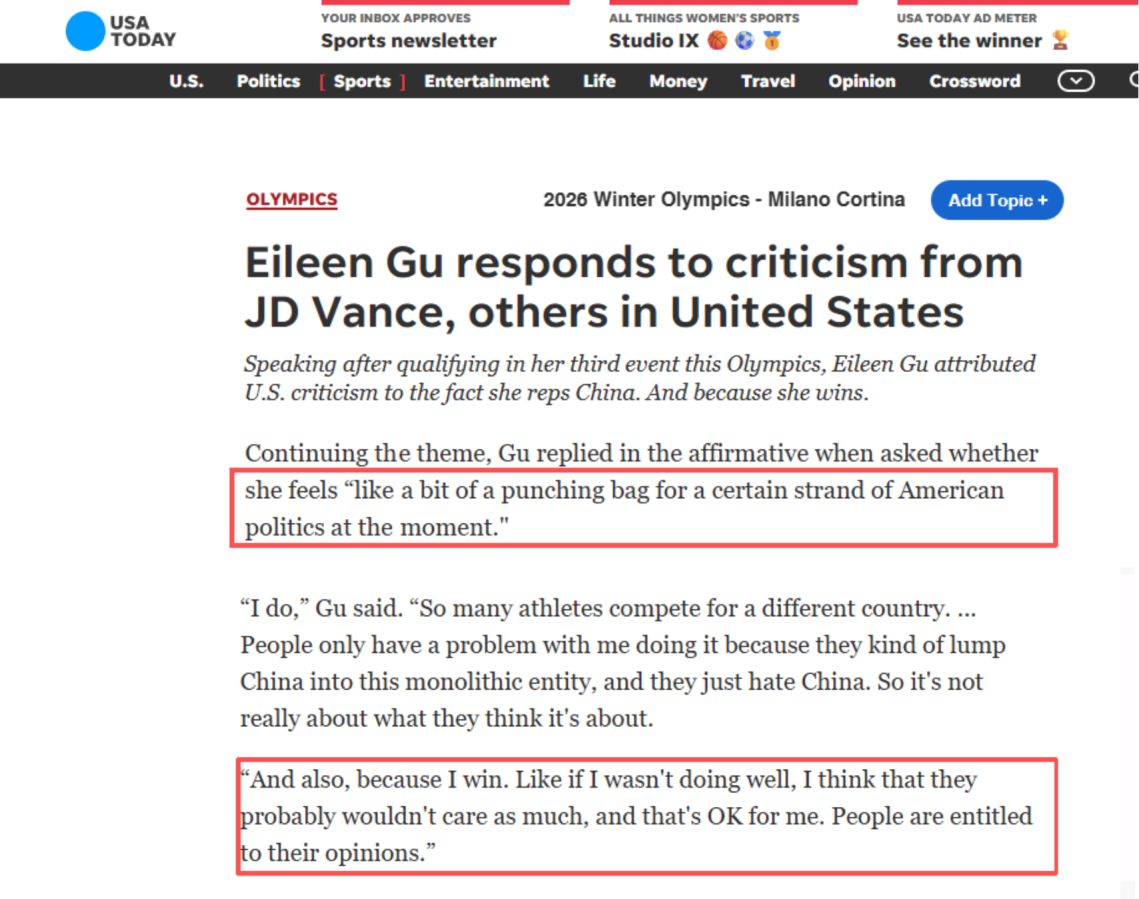 2026年2月19日,谷愛凌在接受《今日美國(guó)》時(shí)坦言自己像是某種美國(guó)政治勢(shì)力下的“靶子”。