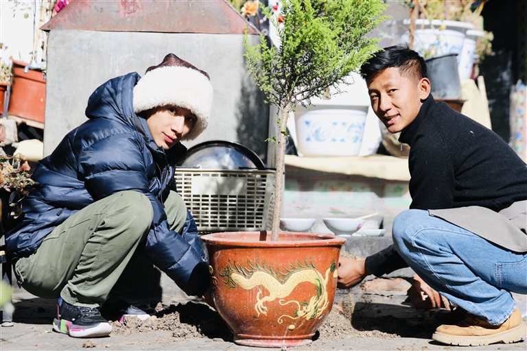 旦增特覺(右)和旦增格桑(左)正在移栽新買的青松樹。記者 格桑倫珠 央金 攝