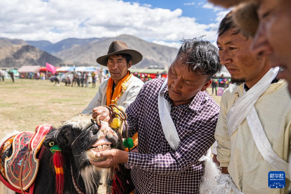 5月29日,工作人員通過(guò)檢查牦牛牙口判斷其是否具備參賽資格。新華社記者 丁增尼達(dá) 攝