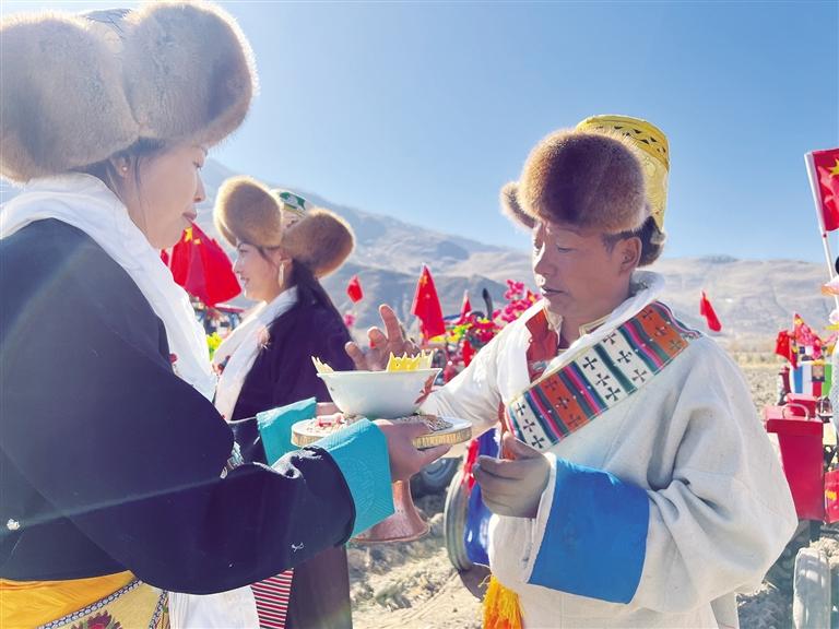 在巴嘎雪村,村民們早早地在田間等待著儀式的舉行。巴嘎雪村二組的旦巴曲桑說:“這是我第三次參加春播儀式,我們在舉行開耕儀式的前幾天,家家戶戶都要釀造青稞酒,還要給‘鐵牛’準備裝飾品。在春播儀式開始的這一天,全家人都穿上節(jié)日盛裝,并將耕牛和拖拉機也打扮得漂漂亮亮的,祈求五谷豐登?!?/p>