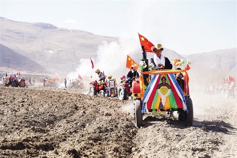 春耕儀式開始之前,犁手們依次吃糌粑、敬青稞酒、煨桑、獻哈達,每個人臉上都流露著幸福的笑容?!拌F?!眰冊谔镩g一字排開,浩浩蕩蕩駛進農(nóng)田,后面跟著盛裝打扮的姑娘,她們手持種子、肥料撒入農(nóng)田。這是來自春天的希望,希望秋收滿倉。