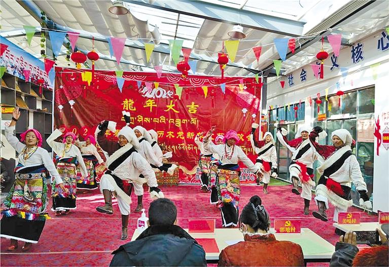 圖為仲巴縣吉瑪鄉(xiāng)春節(jié)藏歷木龍新年文藝聯(lián)歡會(huì)現(xiàn)場(chǎng),群眾在表演歌舞節(jié)目。 記者 汪純 攝