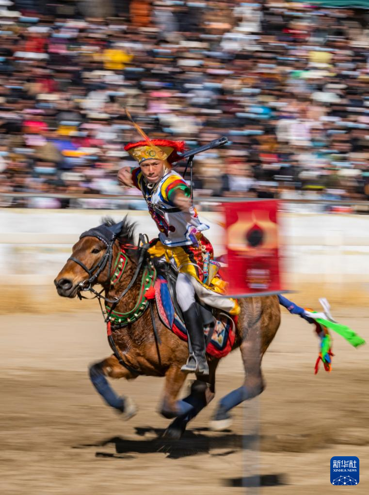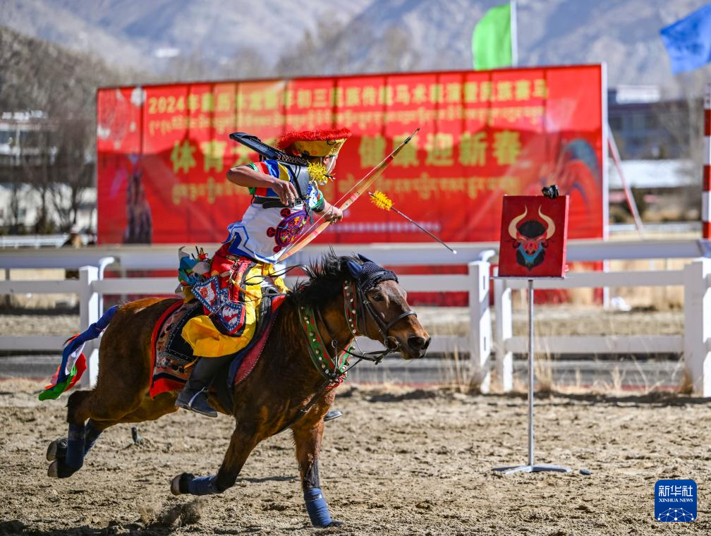在拉薩賽馬場(chǎng),騎手表演馬上射箭(2月12日攝)。新華社記者 孫非 攝