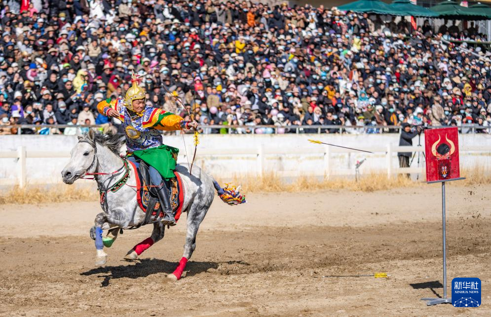 在拉薩賽馬場(chǎng),騎手表演馬上射箭(2月12日攝)。新華社記者 孫瑞博 攝