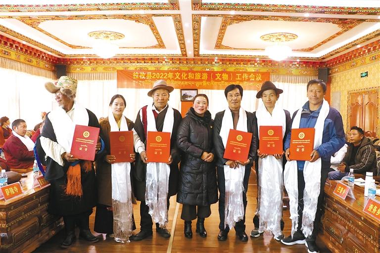 會(huì)議總結(jié)了拉孜縣2021年度文化和旅游(文物)相關(guān)工作,向8家文化企業(yè)發(fā)放了市級(jí)文化產(chǎn)業(yè)示范基地牌子;7支藏戲隊(duì)發(fā)放藏戲傳習(xí)點(diǎn)牌子;30家文保單位發(fā)放了文保單位全景圖;8名非遺傳承人發(fā)放了非遺傳承人證書。