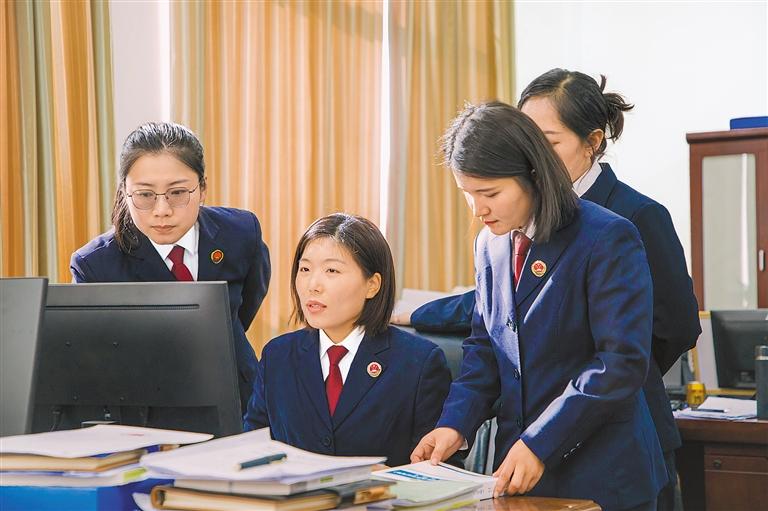 圖為席淑姣(左二)積極發(fā)揮傳幫帶作用,向年輕同事傳授辦案經(jīng)驗(yàn)。
