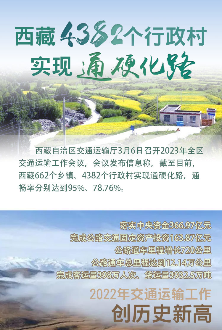 西藏自治區(qū)交通運(yùn)輸廳3月6日召開(kāi)2023年全區(qū)交通運(yùn)輸工作會(huì)議,會(huì)議發(fā)布信息稱(chēng),截至目前,西藏662個(gè)鄉(xiāng)鎮(zhèn)、4382個(gè)行政村實(shí)現(xiàn)通硬化路,通暢率分別達(dá)到95%、78.76%。 [詳細(xì)] -
