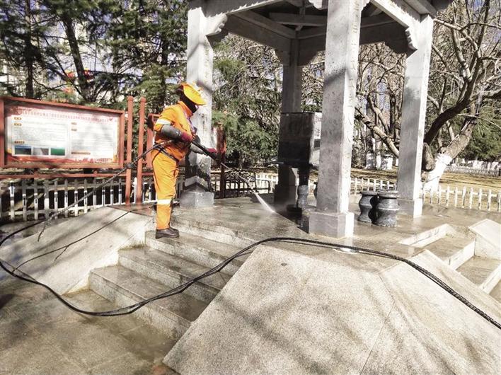 2月13日早上10點(diǎn),由西藏拉薩市城關(guān)區(qū)環(huán)衛(wèi)局局長(zhǎng)米瑪次仁牽頭,拉薩市城市建設(shè)投資經(jīng)營(yíng)有限公司相關(guān)領(lǐng)導(dǎo)配合,調(diào)動(dòng)50名保潔人員、4臺(tái)高壓沖洗車(chē)和1輛8噸灑水車(chē),對(duì)宗角祿康公園內(nèi)原市民活動(dòng)區(qū)域進(jìn)行擦、沖、洗作業(yè)。