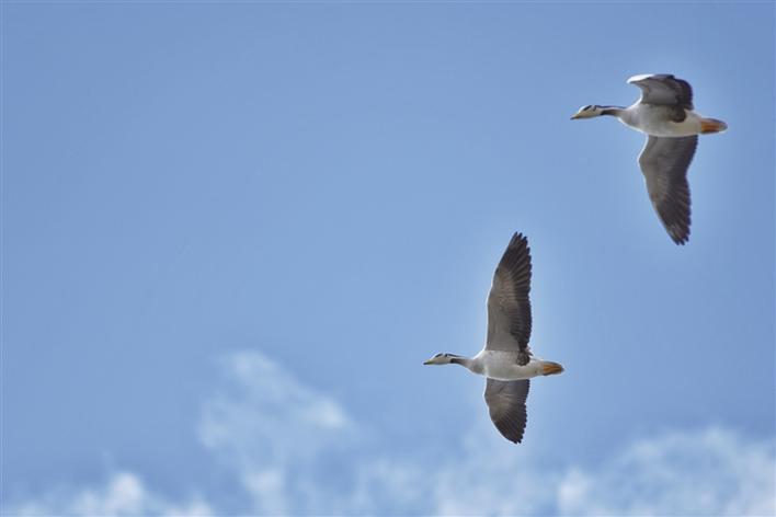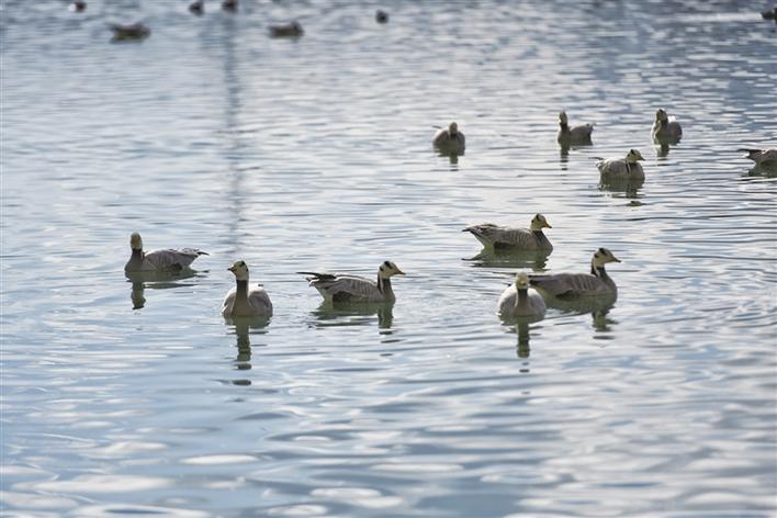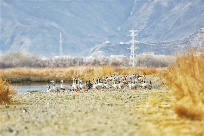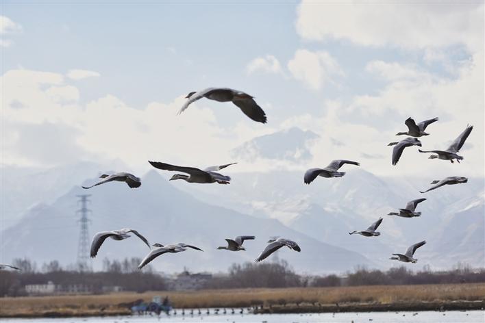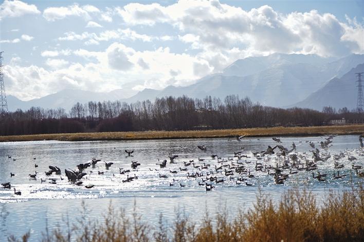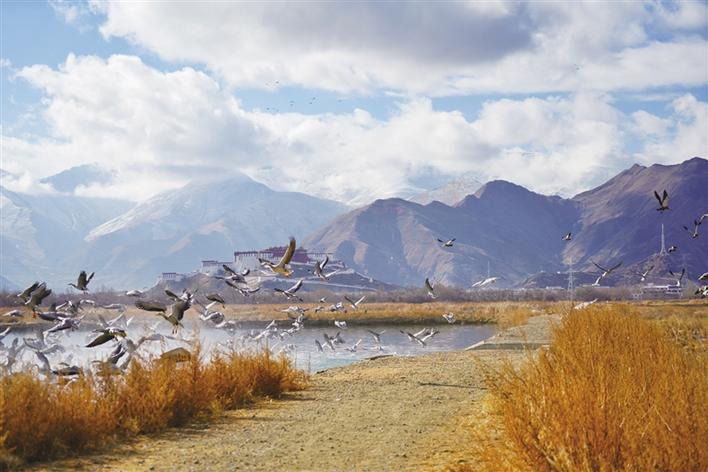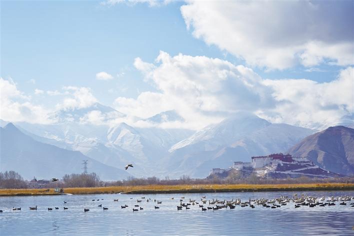 遠處,連綿起伏的山頂還覆蓋著薄薄的積雪,布達拉宮雄偉而秀美;近處,濕地內(nèi)隨意顯現(xiàn)出的一塊塊水泊,成群的候鳥在水中玩耍嬉戲、在藍天白云下飛舞。見到可愛的飼養(yǎng)員帶來它們喜歡的麥粒,斑頭雁、紅隼、赤麻鴨、黃鴨等紛紛游上岸來,盡情地享受美食,發(fā)出歡快的叫聲。