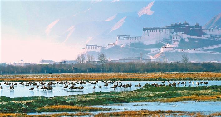 遠(yuǎn)處,連綿起伏的山頂還覆蓋著薄薄的積雪,布達(dá)拉宮雄偉而秀美;近處,濕地內(nèi)隨意顯現(xiàn)出的一塊塊水泊,成群的候鳥在水中玩耍嬉戲、在藍(lán)天白云下飛舞。見(jiàn)到可愛(ài)的飼養(yǎng)員帶來(lái)它們喜歡的麥粒,斑頭雁、紅隼、赤麻鴨、黃鴨等紛紛游上岸來(lái),盡情地享受美食,發(fā)出歡快的叫聲。