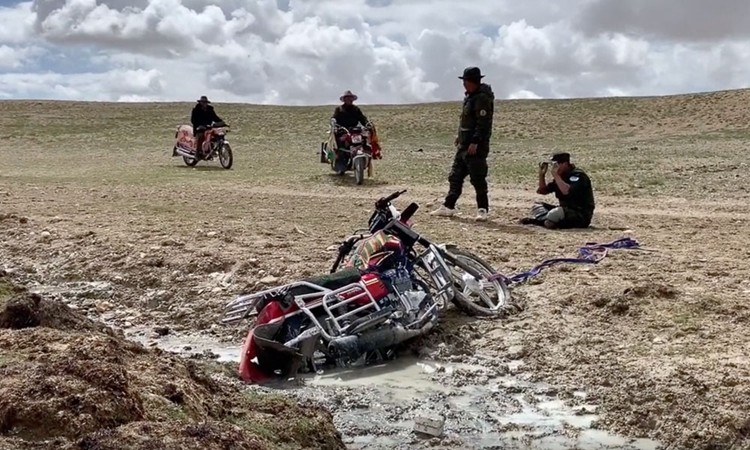騎著摩托車行駛在草原上,危險隨時都有可能發(fā)生。沒過多久,隊員們的一輛摩托車便陷入泥坑中,兩名隊員試圖將摩托車拽出來卻屢試無果。無奈之下只能打電話叫隊友過來幫忙,摩托車才得以脫困。類似的狀況,野保員們早已習(xí)以為常,簡單收拾之后,他們就又出發(fā)了。