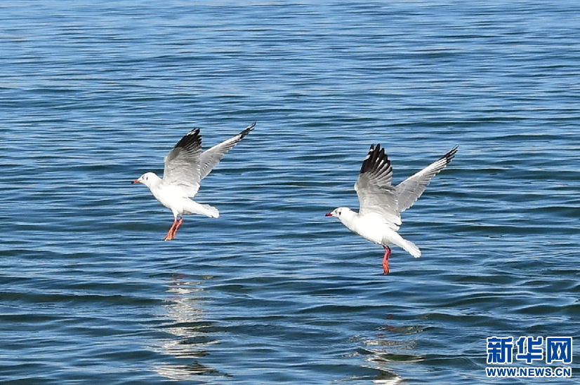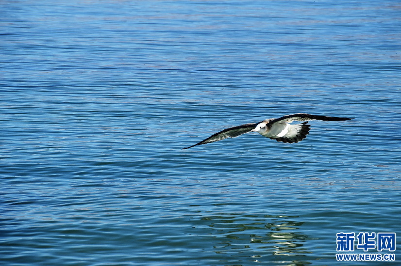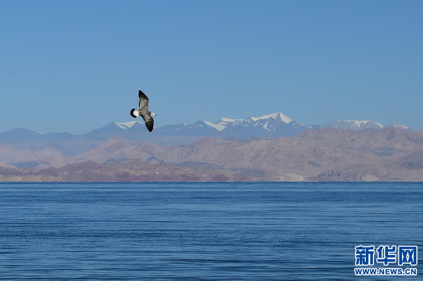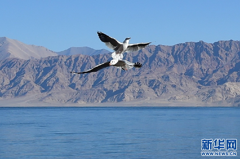 鳥兒在班公湖上空翱翔(10月19日攝)。新華網(wǎng) 張宸攝