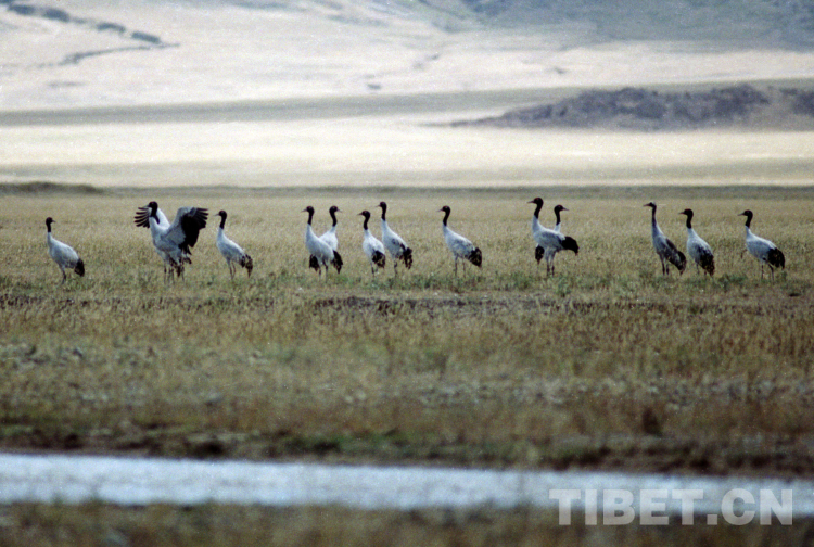 這是在藏北高原申扎縣濕地棲息的國家一級保護動物黑頸鶴(唐召明2001年攝)