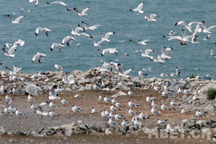 這是在藏北高原班公錯鳥島棲息的成群棕頭鷗(唐召明1995年攝)