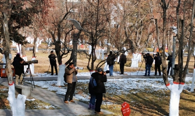 11月25日,記者來到海棠公園,從園方劉主任處了解到,太平鳥大約是一周前陸續(xù)來到海棠公園的,由最初的幾十只到現(xiàn)在的幾百只,甚至上千只,越聚越多。以前每年海棠公園也會有太平鳥光顧,但是沒有今年這么多。太平鳥每年來到海棠公園主要是來吃海棠果的,海棠公園500棵海棠樹,入冬后果實(shí)變得透紅,一串一串的紅果果,吸引了無數(shù)太平鳥到這里聚餐,成為海棠公園一道獨(dú)特的風(fēng)景。因每年這個(gè)時(shí)候都是太平鳥來海棠公園做客的時(shí)間,11月24日下午,海棠公園里早早的就聚集了二三十個(gè)等候的攝影師,其中有來自四川、甘肅、山西的,也有當(dāng)?shù)氐臄z影愛好者。他們扛著“長槍短炮”不畏嚴(yán)寒蹲守著,全力以赴抓拍著太平鳥的美麗身姿。