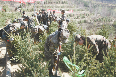兵站部官兵進(jìn)行參與西寧南北山綠化
