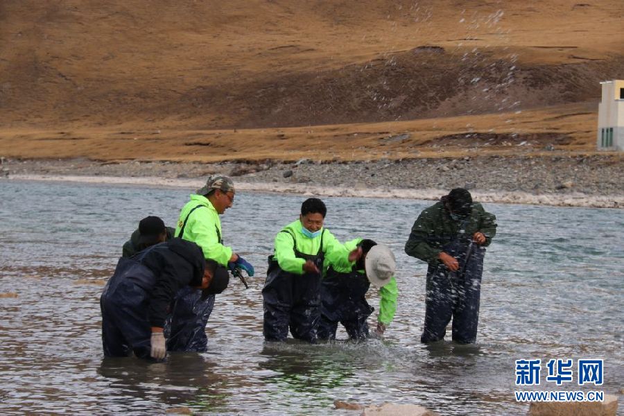 三江源國(guó)家公園治多生態(tài)環(huán)保協(xié)會(huì)的志愿者在清理河道內(nèi)的垃圾(7月11日攝)。新華社發(fā)