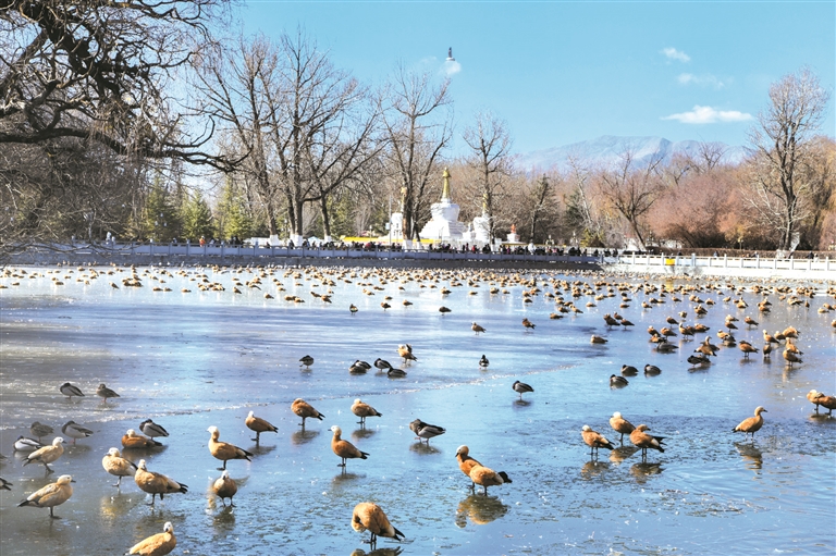 圖為宗角祿康公園的候鳥在結(jié)冰的湖面嬉戲、覓食。 貢嘎來松攝