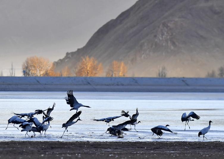 冬日,大批黑頸鶴在西藏拉薩市林周縣境內(nèi)棲息、覓食。 林周縣黑頸鶴自然保護區(qū)建立于1993年,2003年被設(shè)立為國家級自然保護區(qū),是雅魯藏布江中游自然保護區(qū)的核心部分,在每年的11月底至12月初,這里便會迎來成群的黑頸鶴過冬。