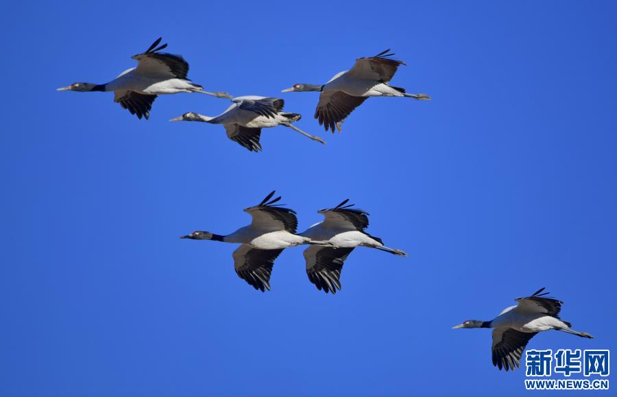 黑頸鶴在自然保護區(qū)上空飛翔(2021年1月3日攝)。新華社記者 張汝鋒 攝