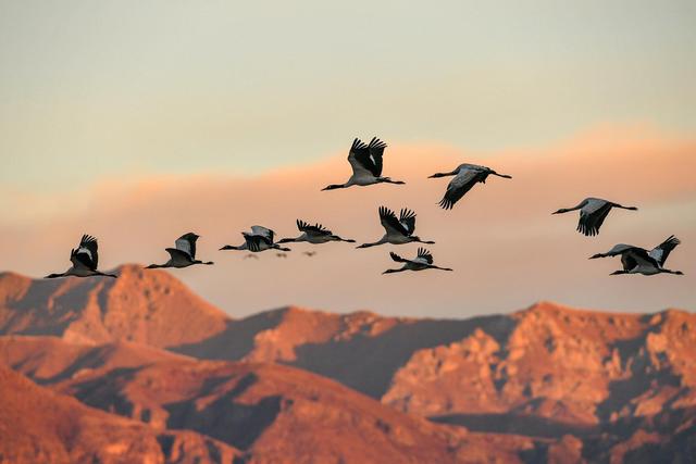 黑頸鶴在拉薩市林周縣黑頸鶴自然保護區(qū)上空飛翔(2019年1月1日攝)。新華社記者 張汝鋒 攝