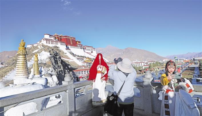 圖為游客在布達(dá)拉宮前拍照留念。格桑倫珠 攝