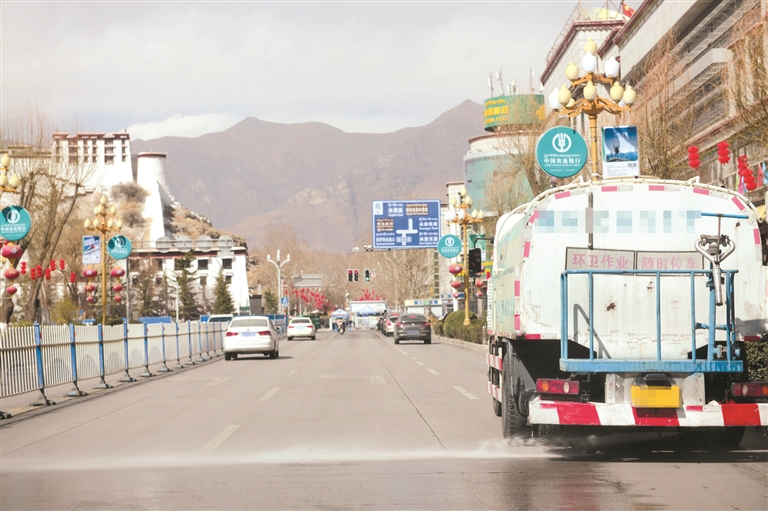 圖為灑水車正在澆灌道路兩旁的樹木。 拉薩融媒記者 巴桑次仁攝