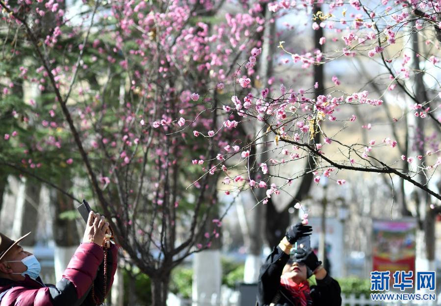 3月4日,人們在拉薩龍王潭公園賞花、拍照。新華社記者 覺果 攝