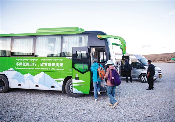 游客在珠穆朗瑪峰景區(qū)停車場轉(zhuǎn)乘環(huán)保客車(2019年5月16日攝)。珠穆朗瑪峰景區(qū)內(nèi)自2019年5月開始試運營清潔能源環(huán)??蛙?,以進一步平衡珠峰地區(qū)旅游發(fā)展與環(huán)境保護需要。新華社記者 孫非 攝