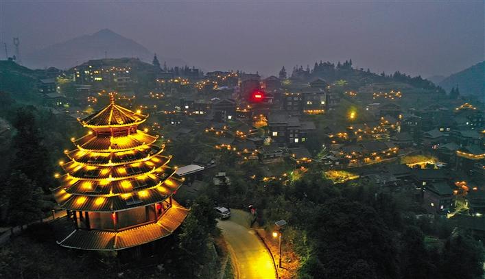 在廣西柳州市三江侗族自治縣八江鎮(zhèn)布央村,太陽能路燈和鼓樓上的太陽能裝飾燈讓鄉(xiāng)村的夜晚亮了起來(2020年12月28日攝,無人機照片)。 新華社發(fā) (黎寒池 攝)