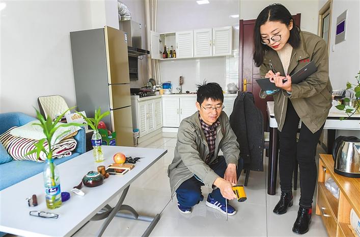 河北省安平縣一家熱力公司員工入戶測量室內(nèi)地暖溫度(2019年11月15日攝)。2018年以來,安平縣利用玉米秸稈等農(nóng)林廢棄物大力推行生物質(zhì)能源供熱的供暖模式,減少污染排放,綠色節(jié)能型能源走進了千家萬戶。 新華社記者 李曉果 攝