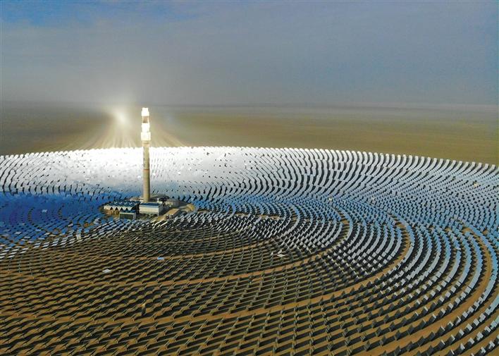 在甘肅省敦煌市向西約20公里處,被稱為“超級鏡子發(fā)電站”的首航高科敦煌100兆瓦熔鹽塔式光熱電站在戈壁灘上閃耀(2021年2月24日攝,無人機照片)。新華社記者 馬希平 攝