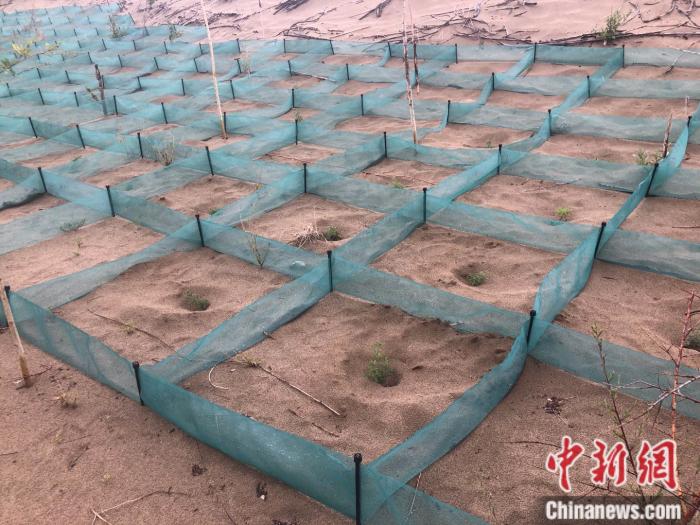 “傳統(tǒng)的方法是用廢樹枝等擺成方格等一定的形狀壓沙,里面再種上植物,效果很好但樹枝往往四五年就腐爛了;最近我們在嘗試推廣一種新型化學(xué)材料方格,成規(guī)??欤夷芫S持七到十年?!敝袊茖W(xué)院西北生態(tài)資源研究院研究員常學(xué)向?qū)τ浾哒f。