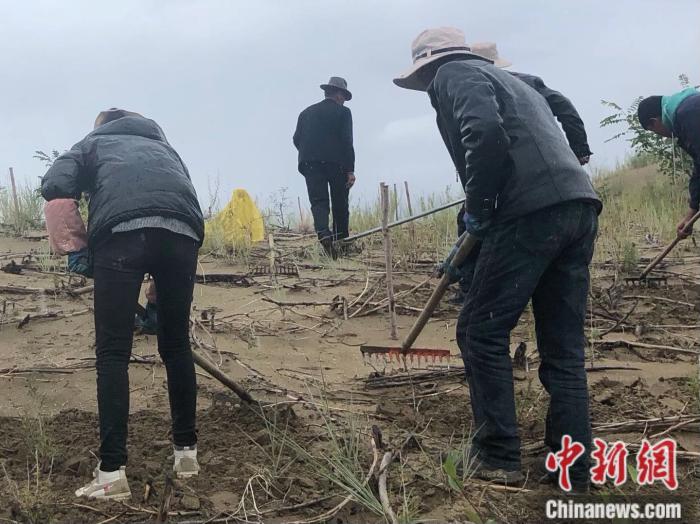 工人在沙丘上進(jìn)行防沙治沙勞作。 中新網(wǎng)左宇坤 攝