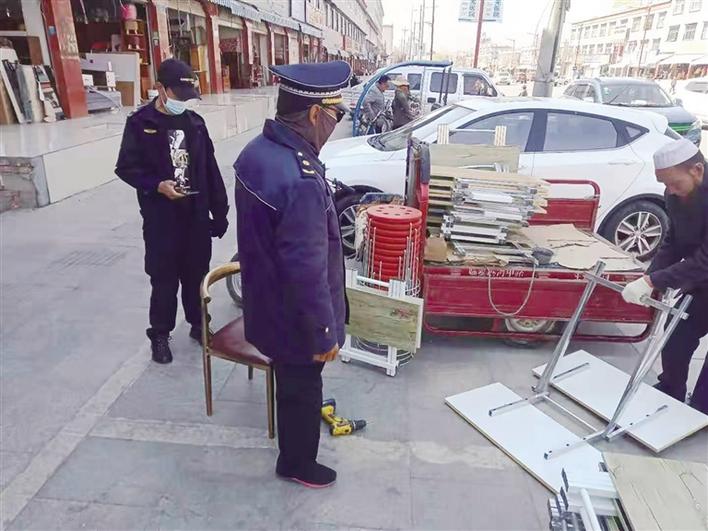執(zhí)法人員對占道經(jīng)營商戶進行勸說。圖由城關區(qū)城管局提供