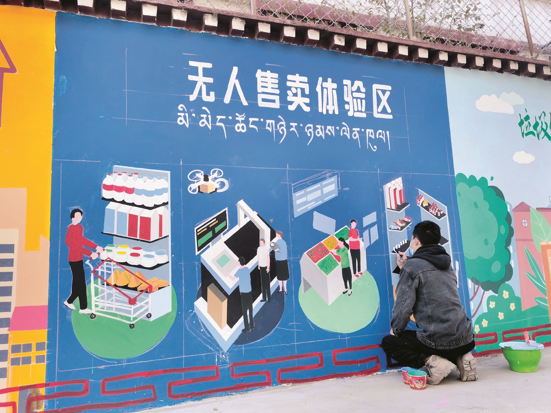 近日,記者在繞賽社區(qū)哈達(dá)巷里看到,有三名工作人員正在給西墻進(jìn)行繪畫藝術(shù)創(chuàng)作,整體的墻繪已經(jīng)基本形成,正對(duì)一些細(xì)節(jié)進(jìn)行補(bǔ)充,引來不少過往群眾圍觀拍照。墻繪顏色鮮艷、主題突出,分為四個(gè)板塊,分別是爭當(dāng)文明志愿者體驗(yàn)區(qū)、文明問答體驗(yàn)區(qū)、無人售賣體驗(yàn)區(qū)、垃圾分類體驗(yàn)區(qū)。