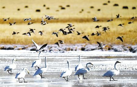 越冬的大天鵝和眾多候鳥(niǎo)在尕海濕地浴雪歡歌,翩翩起舞。