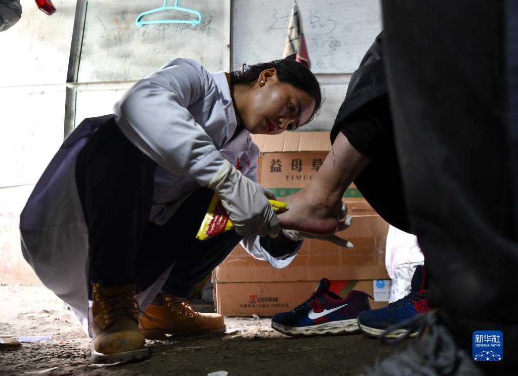 西藏那曲市比如縣良曲鄉(xiāng)然木塘村蟲草采集點(diǎn)的營地里,政府為采集點(diǎn)配備的醫(yī)護(hù)人員在給采集蟲草時受傷的牧民治療(5月26日攝)。新華社記者 晉美多吉 攝