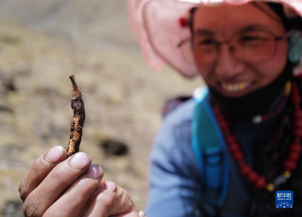 牧民其美嘎德展示剛采集到的蟲草(5月25日攝)。新華社記者 劉潁 攝