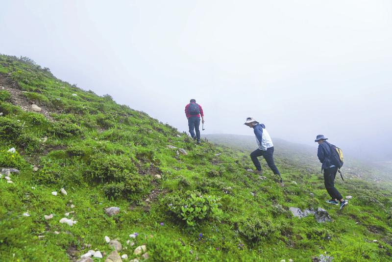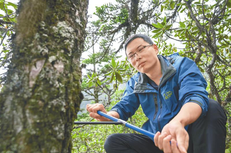 垂直距離只有300米,但密林中的行進并不容易。在向?qū)ьI(lǐng)下,王文志和其學(xué)生抵達了林線處,腳踩松軟的苔蘚,他們展開作業(yè)。