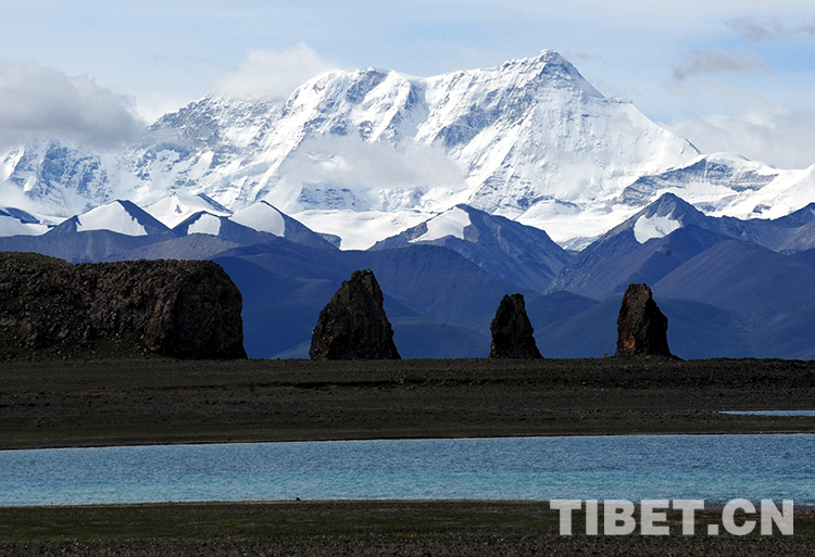 這是納木錯北岸的小島石柱和念青唐古拉山主峰及湖水構(gòu)成了一道美麗的風景線(唐召明2012年8月4日攝)