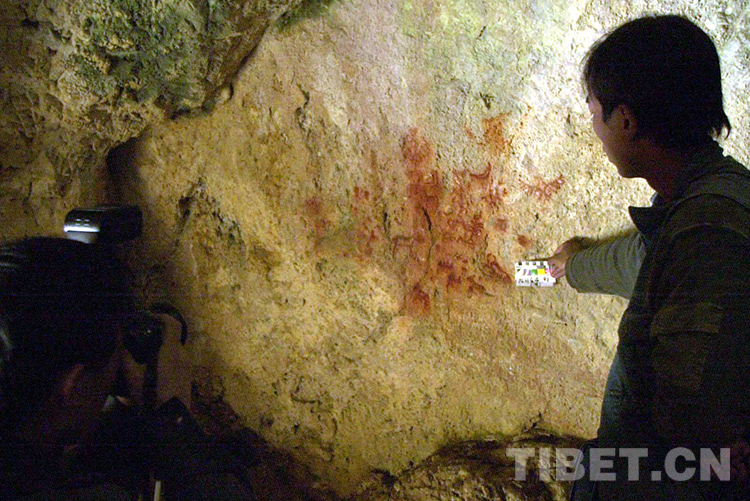 這是科考人員在對一處洞穴巖畫進行考察(唐召明2001年攝)