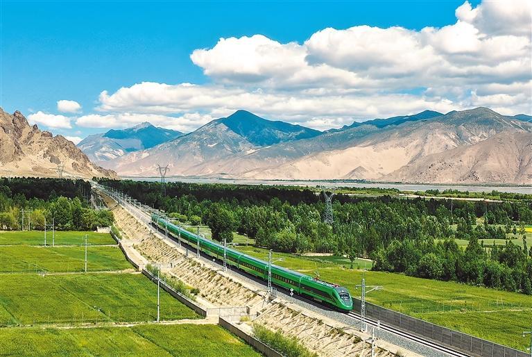 中央支持西藏自治區(qū)基本建成涵蓋公路、鐵路、航空、管道等多種運輸方式的綜合立體交通網(wǎng)絡(luò)。2021年6月25日,川藏鐵路拉林段正式開通運營。圖為開通當(dāng)日,復(fù)興號高原內(nèi)電雙源動車組首次開上青藏高原。