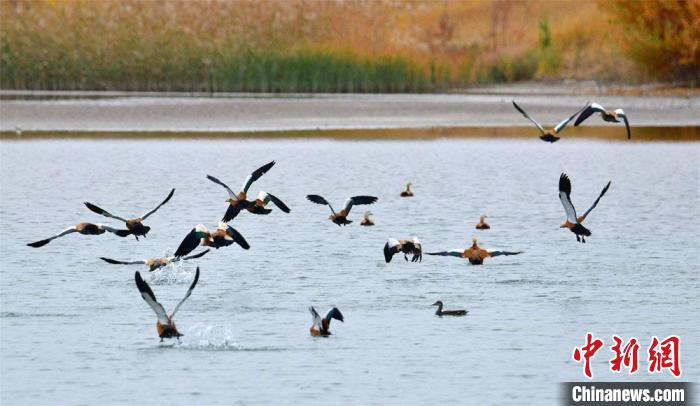 圖為10月底,甘肅敦煌黨河濕地成群野生鳥(niǎo)類翩翩飛舞?!⊥醣筱y 攝