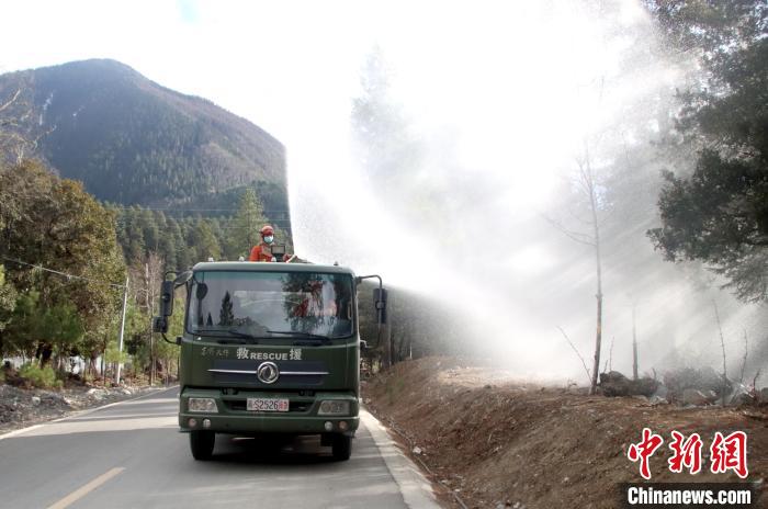 消防隊(duì)員進(jìn)行灑水增濕作業(yè)。 王澤棟 攝