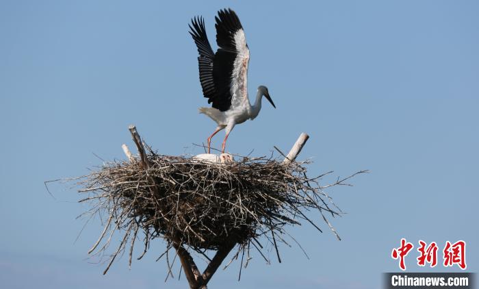 在人工巢內(nèi)的東方白鸛?!『邶埥楹訃?guó)家級(jí)自然保護(hù)區(qū)管理局提供