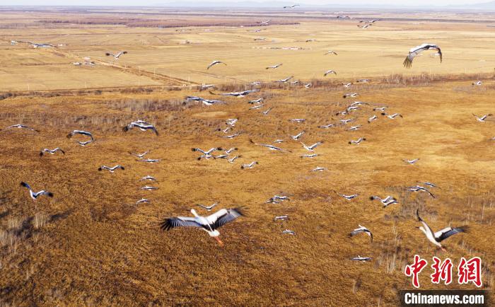 秋季集群的東方白鸛群?!『邶埥楹訃?guó)家級(jí)自然保護(hù)區(qū)管理局提供