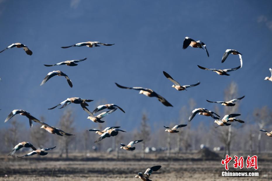 近年來,拉薩水系治理工程的實施,讓拉薩河周邊環(huán)境變得更好。每年10月中下旬,來拉薩越冬的候鳥不斷增多,在拉薩河畔處處都能看見斑頭雁、紅嘴鷗、黃麻鴨等鳥類的身影。據悉,目前,拉薩河城區(qū)段形成了3公里長的湖面水城,水城面積達1258畝,平均水深2.5米,蓄水量約105萬立方米,不僅增加了空氣濕度、含氧量,完善了城市防洪體系,還提高了地下水位,鳥類種群數量增加。圖為一群黃麻鴨在拉薩河畔的農田上飛翔。 貢嘎來松 攝